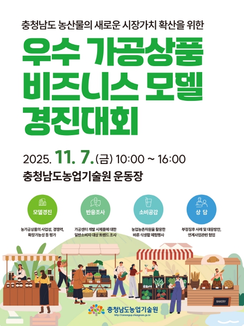 [뉴스앤톡] 충남도 농업기술원은 오는 11월 7일 농가공경영체와 전문가, 일반 소비자 등 300여 명이 참석한 가운데 ‘2025년 우수 가공상품 비즈니스 모델 경진대회’를 개최한다고 30일 밝혔다.