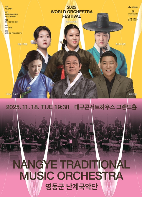 [뉴스앤톡] (재)대구문화예술진흥원 대구콘서트하우스는 오는 11월 18일 저녁 7시 30분, 그랜드홀에서 ‘2025 월드오케스트라페스티벌’의 특별한 무대로 ‘영동군 난계국악단’의 공연을 개최한다.