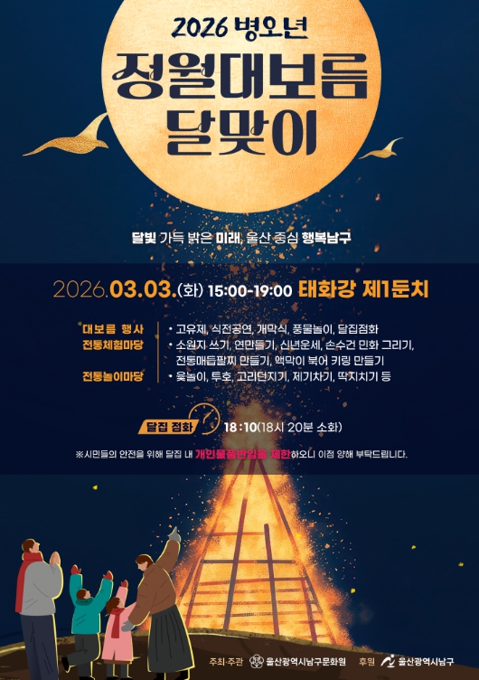 [뉴스앤톡] 울산 남구는 정월대보름을 맞아 오는 3월 3일 오후 3시부터 태화강 제1둔치에서 전통 세시풍속을 계승하고 한 해의 안녕과 풍요를 기원하는 정월대보름 행사를 개최한다고 밝혔다.