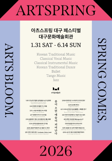 [뉴스앤톡] 대구문화예술회관은 대구를 기반으로 활동하는 지역 예술인들의 공연을 한데 모아 그들의 예술혼을 집중 조명하는 축제 '2026 아츠스프링 대구 페스티벌'의 16개 공연을 오는 1월 31일부터 6월 14일까지 대구문화예술회관에서 개최한다고 밝혔다.