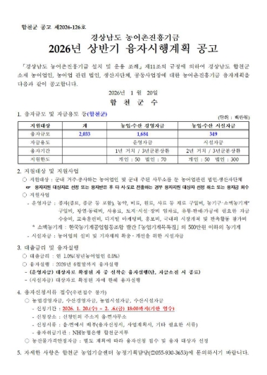 [뉴스앤톡] 합천군은 1월 20일부터 2월 6일까지 경상남도 농어촌진흥기금 융자 신청을 읍·면사무소에서 접수한다.