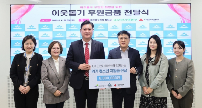 [뉴스앤톡] 인천 미추홀구는 6일 구청장실에서 한국토지주택공사(LH) 인천지역본부(본부장 서환식)로부터 아동복지시설 지원을 위한 온누리상품권 600만 원을 전달받았다.