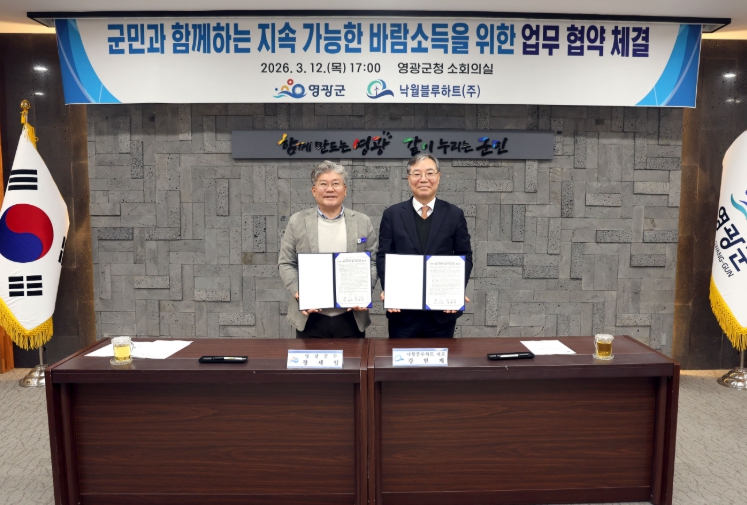 [뉴스앤톡] 영광군은 지난 12일 영광군청 소회의실에서 ‘영광 낙월 해상풍력 발전사업’을 추진 중인 낙월블루하트㈜(대표 강현재)와 군민과 함께하는 지속 가능한 바람소득을 위한 업무 협약을 체결했다고 밝혔다.