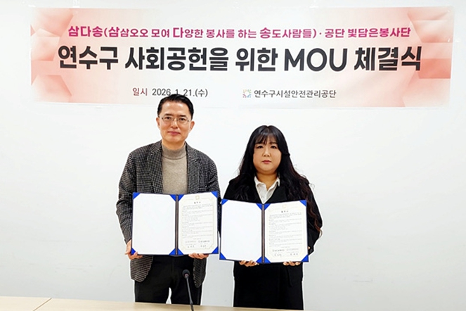 [뉴스앤톡] 연수구시설안전관리공단은 21일 지역주민 중심의 봉사단체인 ‘삼다송 봉사단’과 지역사회 사회공헌 활성화를 위한 업무협약(MOU)을 체결했다고 밝혔다.