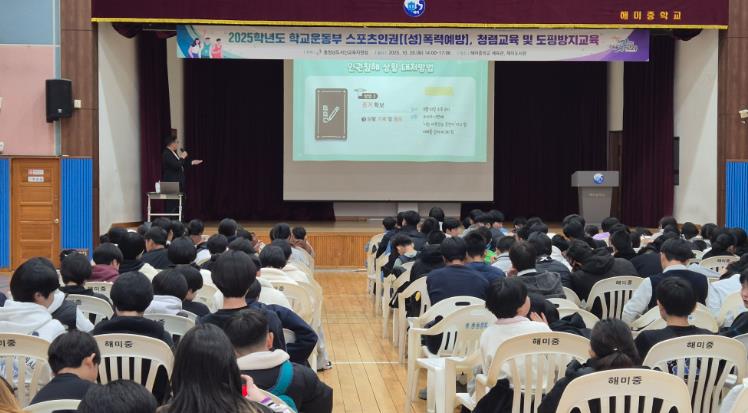[뉴스앤톡] 충청남도서산교육지원청은 지난 28일, 해미중학교 체육관과 해미도서관에서 학생선수, 운동부 지도교사, 운동부 지도자, 전문스포츠지도자를 대상으로 한 '2025학년도 학교운동부 스포츠인권((성)폭력예방), 청렴교육 및 도핑방지교육'을 실시했다.