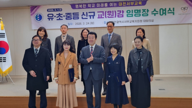 [뉴스앤톡] 대전동부교육지원청과 대전서부교육지원청은 2월 24일, 오는 2026년 3월 1일자 인사발령에 따라 승진 및 전직 임용되는 유·초·중등 신규 교(원)감 임명장 및 인사발령통지서 수여식을 개최했다고 밝혔다.