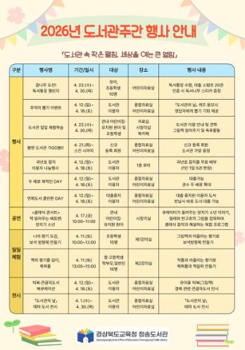 [뉴스앤톡] 경상북도교육청 청송도서관이 2026년 4월 도서관주간을 맞이하여 ‘도서관 속 작은 펼침, 세상을 여는 큰 열림’을 주제로 다양한 독서·문화 프로그램을 운영한다.