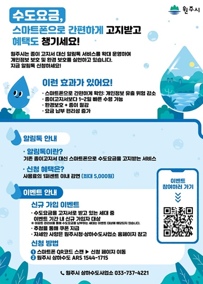 [뉴스앤톡] 원주시상하수도사업소는 ‘수도요금 알림톡 서비스’ 확대를 위해 10월 1일부터 12월 7일까지 신규 가입 이벤트를 진행한다.