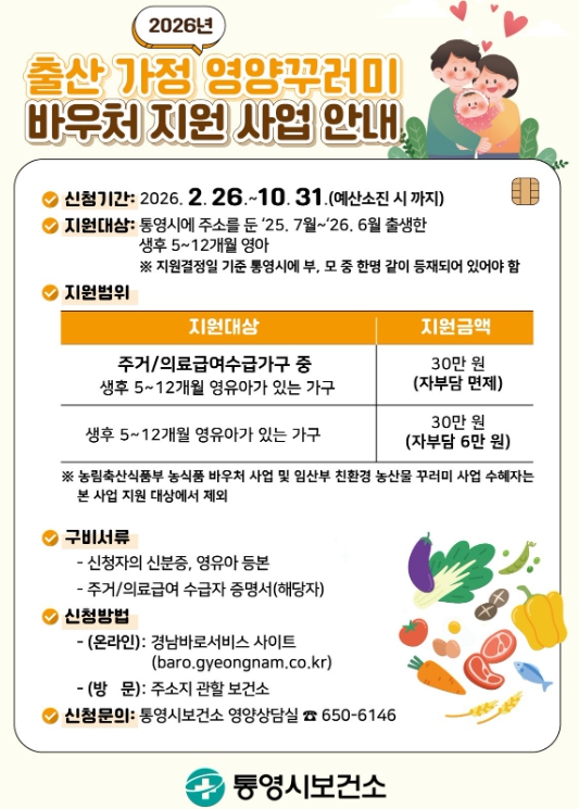 [뉴스앤톡] 통영시는 영아의 건강한 성장·발달 도모 및 출산 가정의 경제적 부담을 완화하기 위해 2026년 신규사업으로 '출산 가정 영양꾸러미 바우처 지원사업'을 시행한다고 24일 밝혔다.