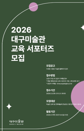 [뉴스앤톡] 대구문화예술진흥원 대구미술관은 2026년 한 해 동안 지역 문화예술발전과 미술관 교육 현장을 함께 만들어 갈 문화자원봉사자 ‘교육 서포터즈’를 모집한다.
