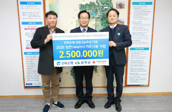 [뉴스앤톡] 전북은행이 연말을 맞이해 완주군청에 취약계층을 위한 ‘2025 방한(Warm) 키트’ 60상자(250만 원 상당)를 전달했다고 18일 밝혔다.
