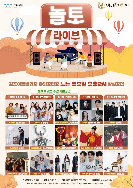 [뉴스앤톡] (재)김포문화재단은 10월 11일부터 11월 22일까지 매월 둘째, 넷째 주 토요일마다 김포아트빌리지 야외공연장에서 하반기 토요상설공연 '놀토 라이브'를 개최한다고 밝혔다.