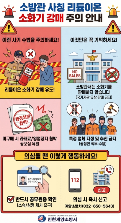[뉴스앤톡] 계양소방서는 최근 소방공무원을 사칭해 리튬배터리용 소화기 등 물품 구매를 요구하는 사기 행위가 발생하고 있다며 시민들의 각별한 주의를 당부했다.