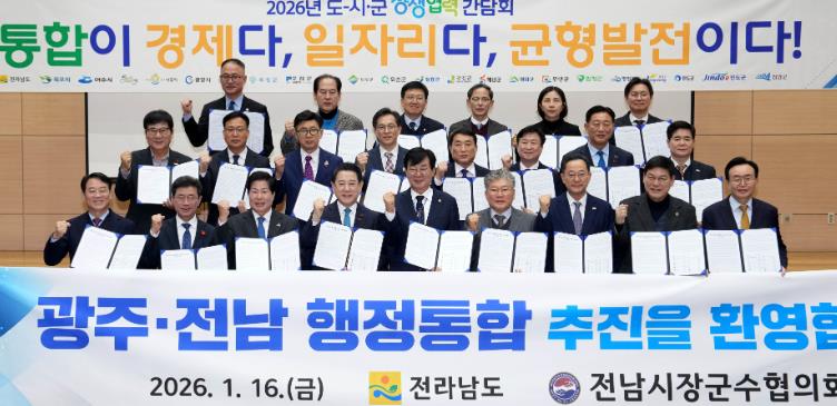 [뉴스앤톡] 전라남도는 16일 전남도청 왕인실에서 ‘2026년 도-시군 상생협력 간담회’를 열어 지역 대도약을 위한 광주·전남 행정통합 추진에 도와 22개 시군이 공동 보조를 맞추기로 했다.