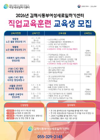 교육신청은 김해시동부여성새로일하기센터 전화·방문 상담 후 접수가 가능하며, 서류 및 면접심사를 거쳐 최종 교육생으로 선발된다.