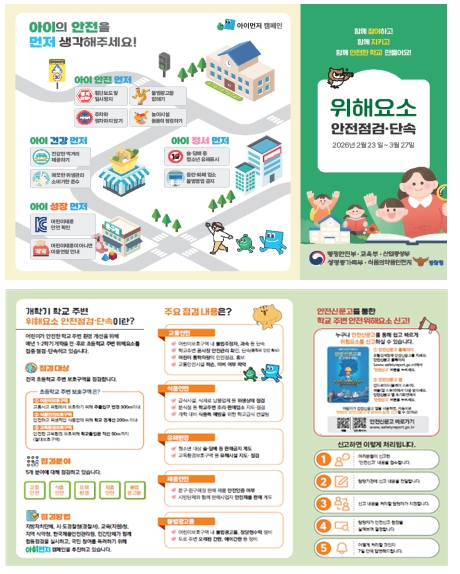 정부는 매년 개학을 앞두고 초등학교 주변 위해요소를 점검해 왔으며, 지난해에는 ▴불법광고물 45만여 건 ▴교통안전 위해요소 19만여 건 ▴청소년 유해환경 1만 7천여 건 ▴식품·위생 관리 미비 1만 6천여 건을 포함해 총 67만여 건의 위해요소를 단속·정비했다.