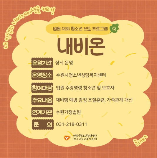 수원시청소년상담복지센터 관계자는 “내비온 프로그램은 단순히 법적 의무 교육이 아니라, 청소년과 보호자가 함께 성장하는 회복적 과정이다. 앞으로도 청소년들이 스스로의 삶을 주도하고 건강한 사회구성원으로 성장할 수 있도록 지속적으로 지원하겠다.”라고 밝혔다.