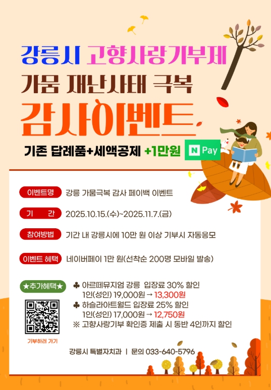주요 내용은 ▲선착순 200명에게 네이버페이 1만 원권을 기존 답례품 외에 추가 제공과 ▲강릉 주요 관광지 할인 혜택 확대이다.