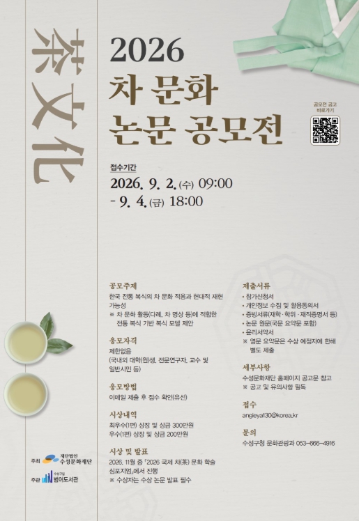 [뉴스앤톡] 대구 수성문화재단 범어도서관은 한국 차 문화 속 복식의 방향성을 탐색하고, 향후 차 문화 기반 시설에서 활용 가능한 복식 모델을 구체화하기 위해 ‘2026 차(茶) 문화 논문 공모전’을 개최한다.
