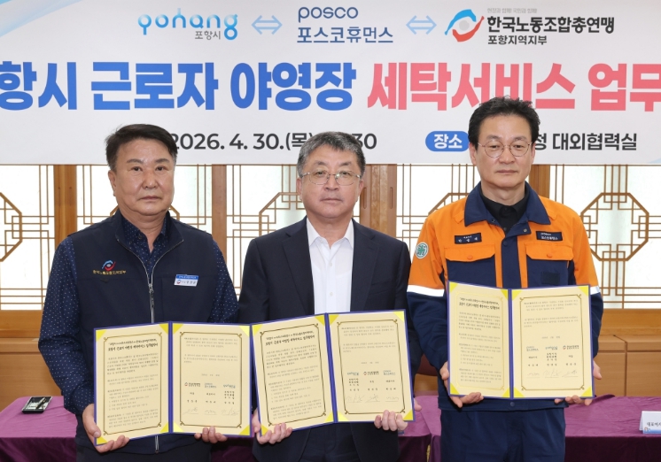 [뉴스앤톡] 포항시는 30일 포스코휴먼스(대표이사 박승대), 한국노총 포항지역지부(의장 정상준)와 ‘포항시 근로자 야영장 세탁서비스 운영’을 위한 업무협약을 체결했다.