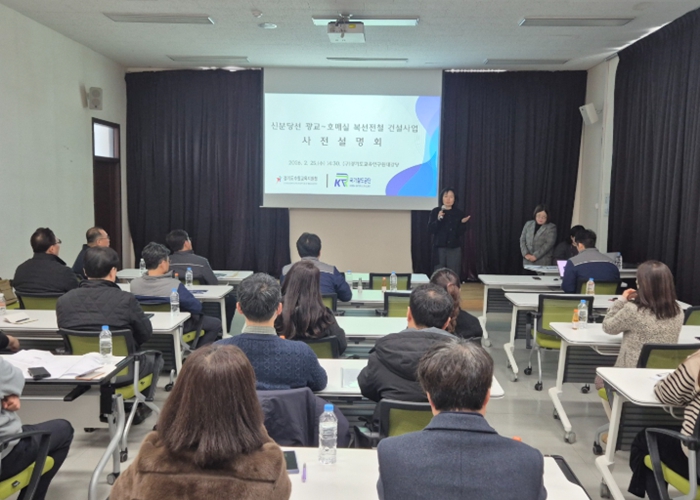 [뉴스앤톡] 경기도수원교육지원청은 신분당선 광교–호매실 복선전철 공사 추진에 앞서 2월 25일 국가철도공단과 함께 공사 구간 100m 이내에 위치한 5개 인접학교를 대상으로 사전설명회를 실시했다고 밝혔다.