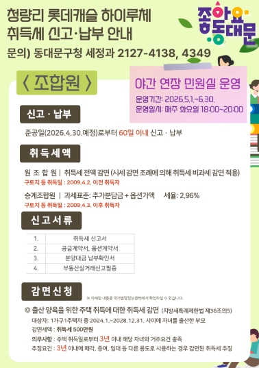 [뉴스앤톡] 서울 동대문구는 14일과 15일 양일간, 이달 말 준공 예정인 청량리 제7구역 재개발 아파트 ‘롯데캐슬 하이루체’ 현장에서 신규 입주민을 위한 ‘찾아가는 맞춤형 세무상담’을 성황리에 마무리했다고 16일 밝혔다.