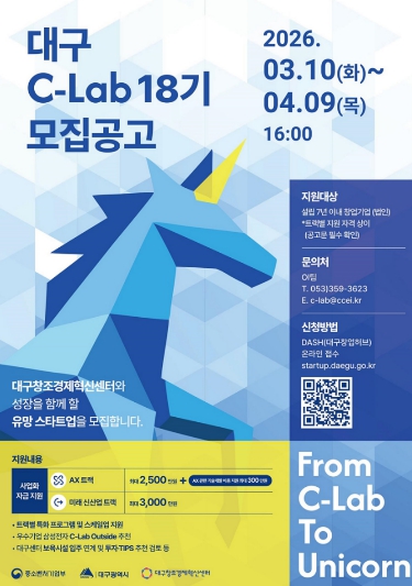 [뉴스앤톡] 대구광역시는 인공지능 전환(AX)을 선도할 혁신 기술 기업과 대구의 미래 전략 신산업을 이끌 유망 스타트업을 발굴하기 위해 ‘대구 C-Lab 액셀러레이팅 18기’ 참여기업을 오는 4월 9일까지 모집한다.