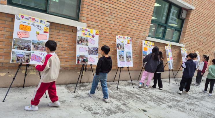| ▲ 덕신초 학생들이 교내에 전시된 '우리들의 행복한 순간' 사진을 관람하고 있다. |