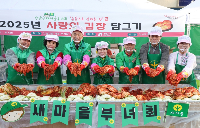 [뉴스앤톡] 꿈이 모이는 도시, 미래를 그리는 강남구(구청장 조성명)가 11일 구청 주차장에서 강남구새마을부녀회(회장 박조연)와 함께 ‘2025 사랑의 김장 담그기’ 행사를 개최했다. 강남구새마을부녀회를 비롯해 새마을협의회, 새마을청년회 등 총 90여 명이 참여했으며, 회원들은 김장김치 10kg 500박스(총 5,000kg)를 직접 담갔다.