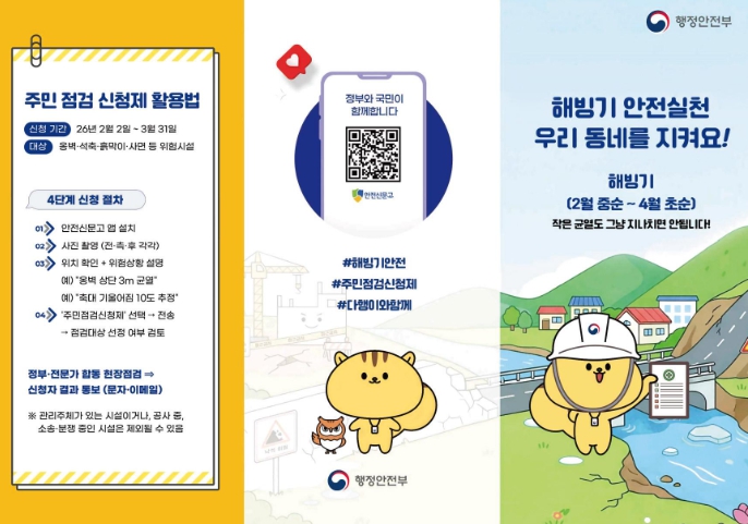 신청 방법은 2월 2일부터 3월 13일까지 온라인으로 안전신문고 앱 또는 포털을 통해 신청하고 오프라인으로 읍면동 행정복지센터에서 방문 신청할 수 있다. 사유지는 시설물 소유자가 신청하고 신청서와 위험 요인을 확인할 수 있는 현장 사진을 함께 제출해야 한다.