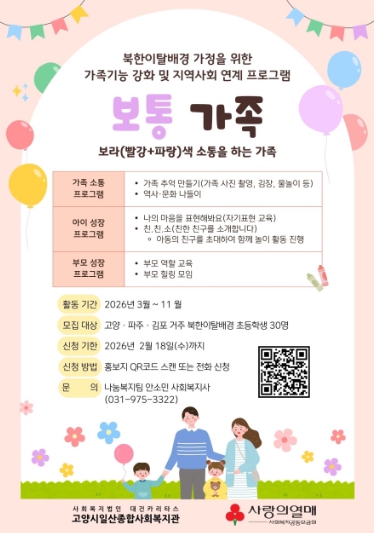 모집 대상은 고양·김포·파주시에 거주하며 초등학생이 있는 가정으로, 아동의 출생지와 관계없이 부모 중 1명 이상이 북한이탈주민인 경우 참여 가능하다. 참여를 원하는 경우 복지관 누리집(홈페이지)에 게시된 홍보문의 QR코드 또는 전화를 통해 신청하면 된다.
