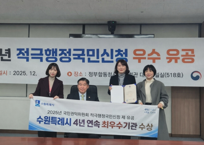 수원시는 24일 정부서울청사 정부합동민원센터에서 열린 2025 국민권익위원회 적극행정국민신청제 우수기관 시상식에서 상장을 받았다. 수원시는 적극행정국민신청제가 도입된 2022년부터 올해까지 4년 연속 우수기관으로 선정되는 성과를 거뒀다.
