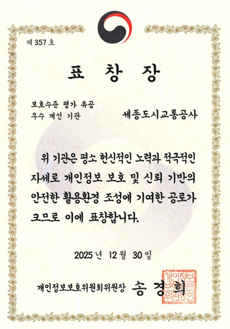 세종도시교통공사 도순구 사장은 “이번 우수 개선 기관 선정은 전년도 평가 결과를 철저히 분석하고, 전사적인 개선 노력을 지속해 온 결과”라며, “앞으로도 개인정보 보호를 공사의 핵심 가치로 삼아 시민의 소중한 개인정보를 더욱 안전하게 보호하고, 신뢰받는 공공기관으로 자리매김하겠다”고 밝혔다.