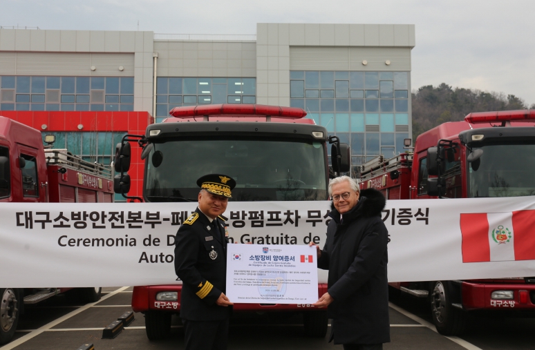 엄준욱 대구소방안전본부장은 “이번에 지원하는 소방자동차가 페루 현지 재난에 실질적으로 활용돼 국민의 안전에 기여하길 바란다”며, “앞으로도 양국 간 우호 협력 증진과 소방안전 환경 개선을 위해 지속적으로 노력하겠다”고 말했다.