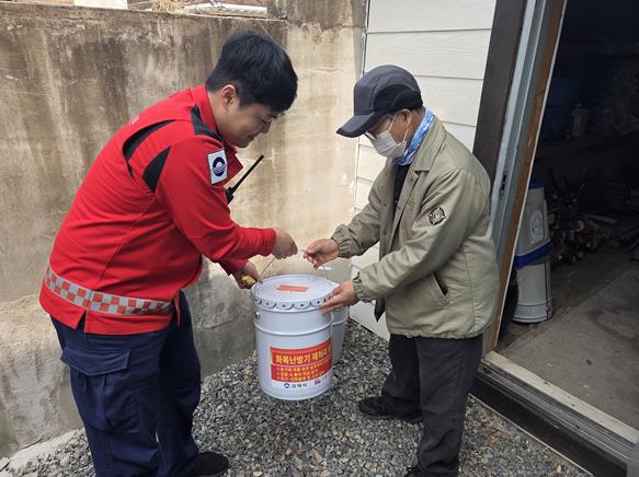 | ▲ 김해시, 화목난방기 사용가구 재처리 용기 보급 개별 방문 산불 예방 홍보 강화 |
