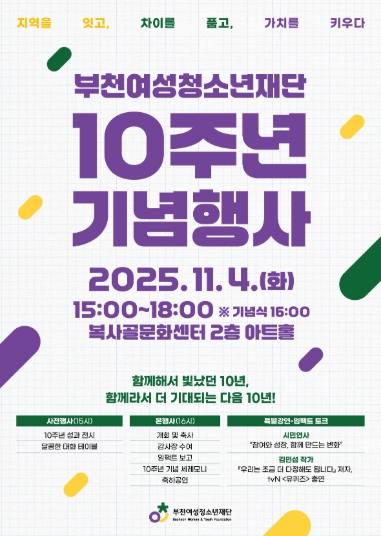 [뉴스앤톡] 부천여성청소년재단은 11월 4일 오후 3시부터 복사골문화센터 2층 아트홀에서 설립 10주년 기념행사를 개최한다. 이번 행사는 지난 10년간의 발자취를 돌아보고, 시민과 함께 만들어갈 다음 10년을 그려보기 위해 마련됐다.