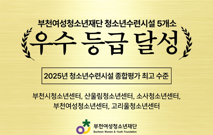 [뉴스앤톡] 부천여성청소년재단이 청소년수련시설 5개소(부천시청소년센터, 산울림청소년센터, 소사청소년센터, 부천여성청소년센터, 고리울청소년센터)가 성평등가족부 주관 2025년 청소년수련시설 종합평가에서 5개 시설 모두 최고 수준인 ‘우수’ 등급을 달성하는 쾌거를 이루었다.