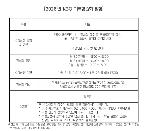 [뉴스앤톡] 2026년 KBO 기록강습회가 1월 30일(금)부터 2월 1일(일)까지 서울 한양대학교에서 개최된다. 기록강습회는 야구 공식기록법의 보급과 이해를 통한 저변 확대를 목적으로 프로야구 원년인 1982년부터 개최됐다.