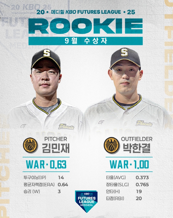 [뉴스앤톡] 2025 메디힐 KBO 퓨처스리그의 9월 퓨처스 루키상 수상자로 투수 부문에는 상무 김민재가 WAR 0.63, 타자 부문에는 상무 박한결이 WAR 1.00을 기록하며 각각 선정됐다.
