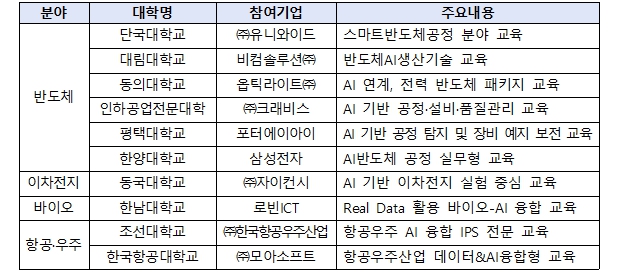 올해는 인공지능 대전환(AX)에 대응하고, 첨단분야 학생들의 인공지능(AI) 융합 역량을 제고하기 위하여, 인공지능(AI) 융합과정 지원 내용이 신설됐다. 이에 따라, 반도체, 바이오 등 첨단산업 인재양성 부트캠프를 운영하고 있는 기존 대학 중 10개교가 선정되어 5억 원을 추가로 지원받는다.