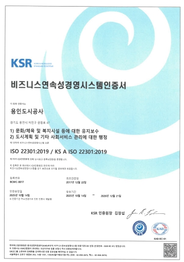 용인도시공사는 2018년 ISO22301(비즈니스연속성경영시스템)을, 2019년 ISO45001(안전보건경영시스템)을 각각 최초 취득한 이후, 매년 정기 사후심사 및 갱신심사를 통해 재난안전 분야의 국제표준을 꾸준히 유지하고 있으며, 시민의 생명과 안전을 지키기 위한 시스템 강화에 지속적으로 힘써왔다.