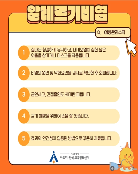 송은철 서울시 감염병관리과장은 “환절기, 특히 가을철에는 알레르기비염 환자가 증가하는 만큼 예방관리 수칙을 꾸준히 실천하고, 센터의 예방 교육에 적극 참여해 건강 피해를 최소화하기 바란다”고 당부했다.