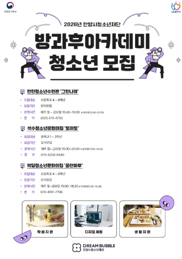 [뉴스앤톡] 안양시청소년재단은 공공 청소년 돌봄 사업인 청소년방과후아카데미의 2026년도 참여 청소년을 모집한다.