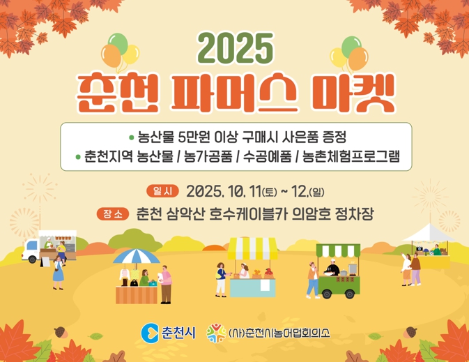 [뉴스앤톡] 춘천시가 오는 11일부터 12일까지 이틀간 삼악산 호수케이블카 의암호 정차장 마당에서 ‘2025 제2회 춘천 파머스마켓’을 연다. 지난 6월에 열린 파머스마켓 1회에 이어 마련된 이번 장터는 춘천시가 주최하고 춘천시귀농귀촌지원센터가 주관한다.