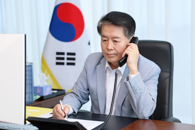 | ▲ 캄보디아 한국인 범죄피해 관련 정명규 재캄보디아한인회장과 통화하는 김경협 재외동포청장 |