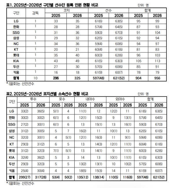 [뉴스앤톡] KBO는 2월 10일(화) 2026년 KBO 리그 소속 선수 명단을 공시했다. 10개 구단은 총 621명의 선수를 등록해, 597명이 등록했던 2025년보다 24명이 늘어났다.