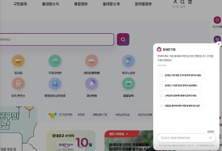 [뉴스앤톡] 서울 동대문구는 지난 20일부터 생성형 인공지능(AI)을 기반으로 한 누리집 챗봇 서비스를 본격 운영하고 있다고 밝혔다.