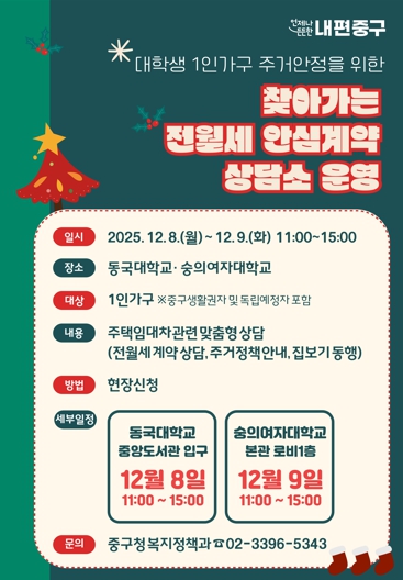 [뉴스앤톡] 서울 중구가 12월 8일과 9일에 동국대학교와 숭의여자대학교에서 대학생 1인 가구의 전월세 계약에 대한 불안과 부담을 덜어줄‘찾아가는 전월세 안심계약 상담소’를 운영한다. 지난 6월에 이은 두 번째 방문이다.