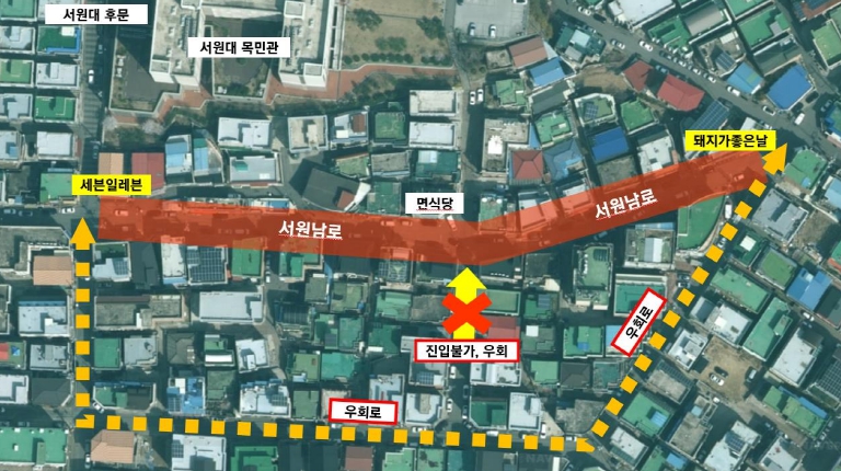 통제 구간은 서원남로(세븐일레븐 서원대점~돼지가좋은날) 230m 구간이며, 축제 당일인 31일 오전 9시부터 오후 10시까지 자가용·오토바이·전동킥보드 등을 포함한 모든 차량의 통행이 금지된다.