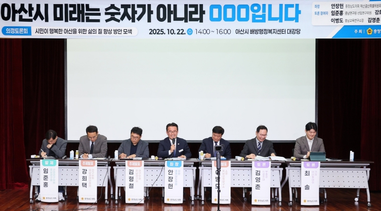 도의회는 22일 아산시 배방행정복지센터 대강당에서 ‘아산시 미래는 숫자가 아니라 ○○○입니다’를 주제로 의정토론회를 개최했다. 토론회 좌장인 안장헌 의원(아산5·더불어민주당)은 “도시의 발전은 숫자와 순위로 평가되는 것이 아니라 시민의 일상 속 행복으로 증명돼야 한다”며 “오늘 이 토론회가 시민의 생각이 정책으로 이어지는 계기가 되길 바란다”고 말했다.